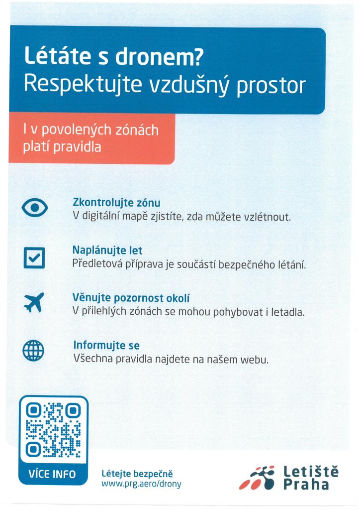 Vzhledem ke zvýšenému výskytu bezpilotních letadel (UAV) a bezpilotních systémů (UAS) připravilo Letiště Praha přehled pravidel jejich provozu, který najdete na webové stránce: www.prg.aero/drony.