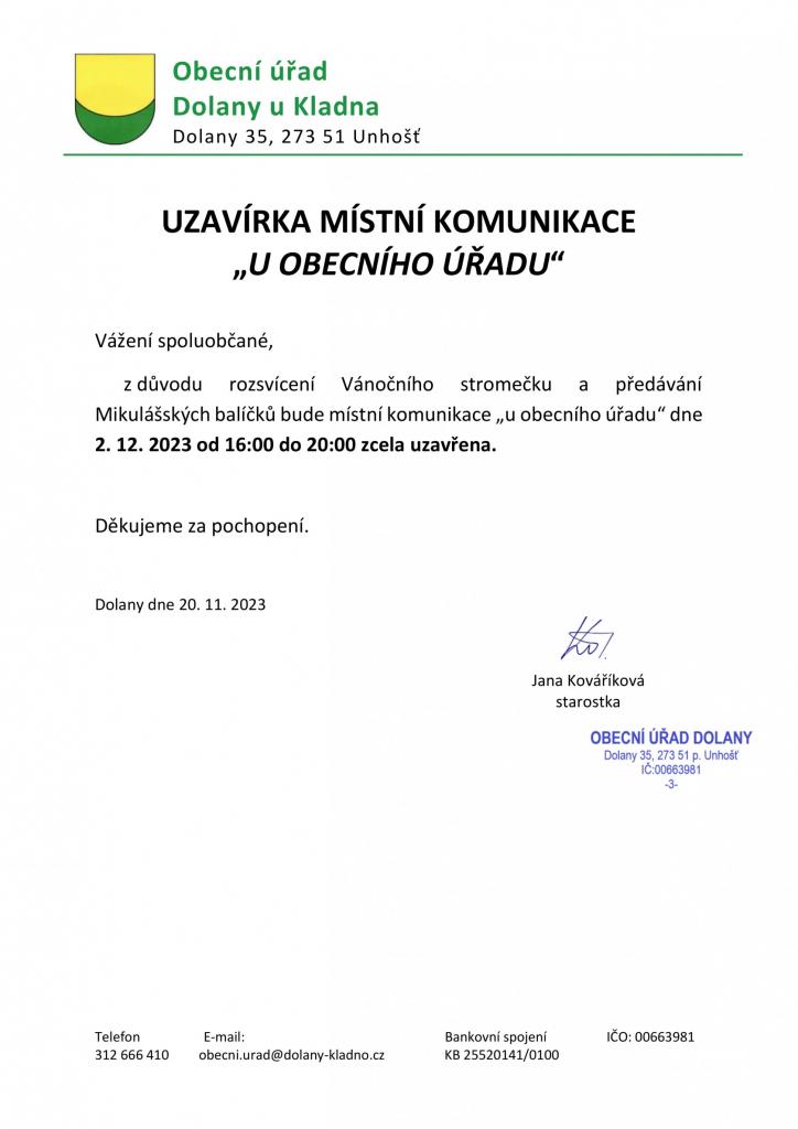 z důvodu rozsvícení Vánočního stromečku a předávání Mikulášských balíčků bude místní komunikace „u obecního úřadu“ dne 2. 12. 2023 od 16:00 do 20:00 zcela uzavřena.