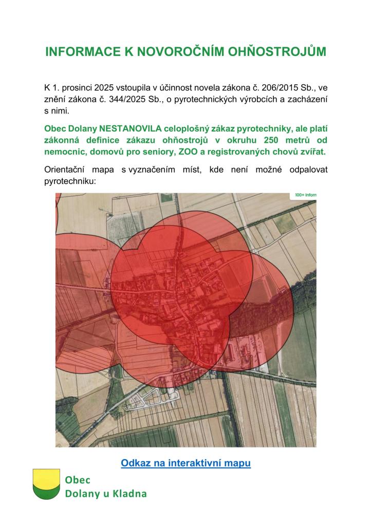 Obec Dolany NESTANOVILA celoplošný zákaz pyrotechniky, ale platí zákonná definice zákazu ohňostrojů v okruhu 250 metrů od nemocnic, domovů pro seniory, ZOO a registrovaných chovů zvířat.